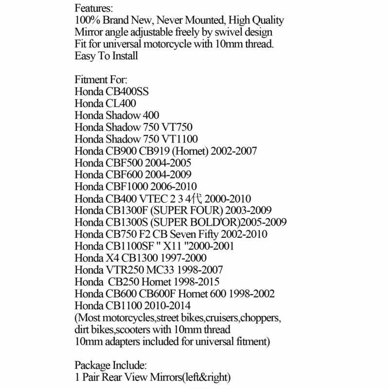 1 Pair Rear View Mirror for Honda CB400SS VT750 CBF500 (2004-2005) Black