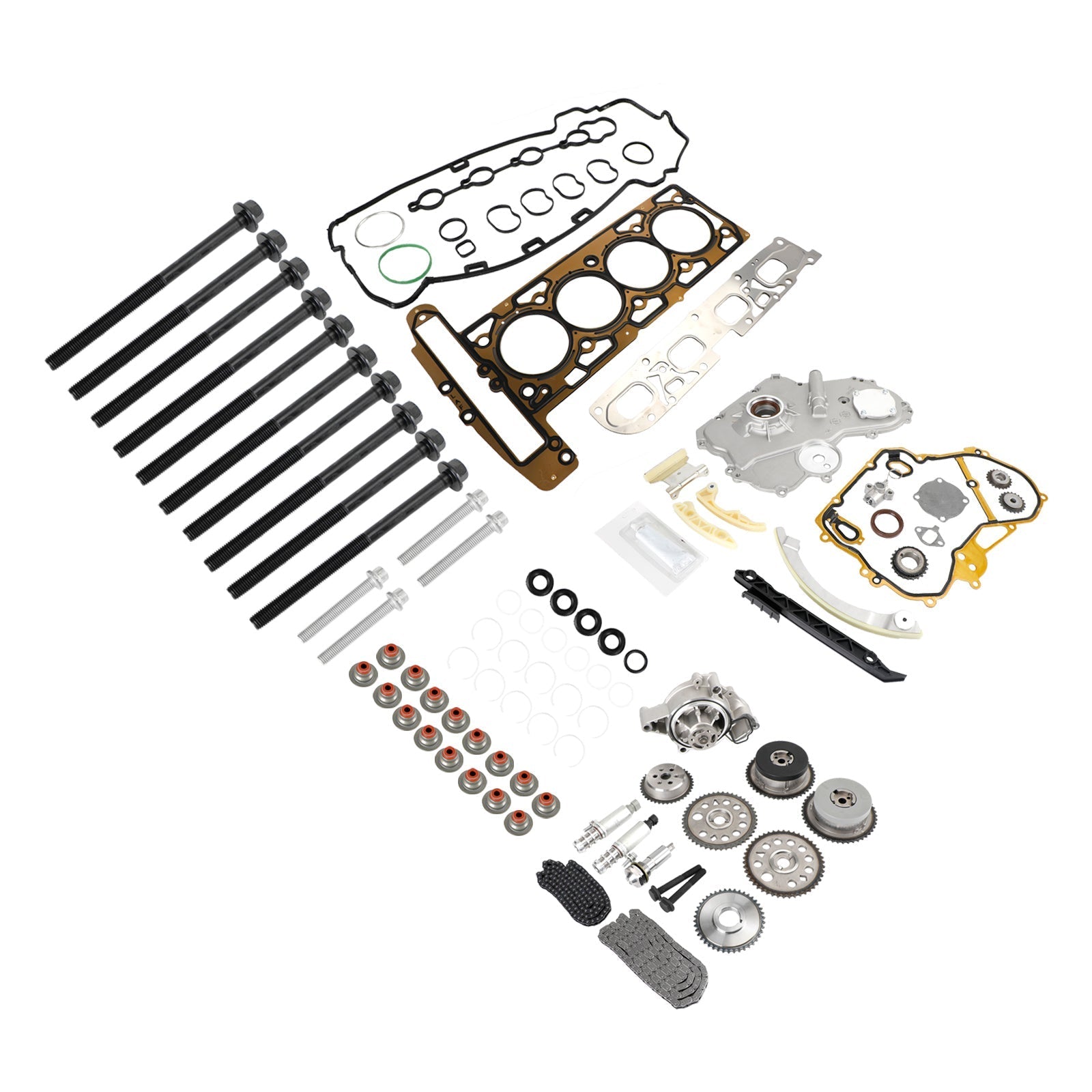 - Comprehensive kit with timing chain, oil pump, tensioners, guides, and sprockets