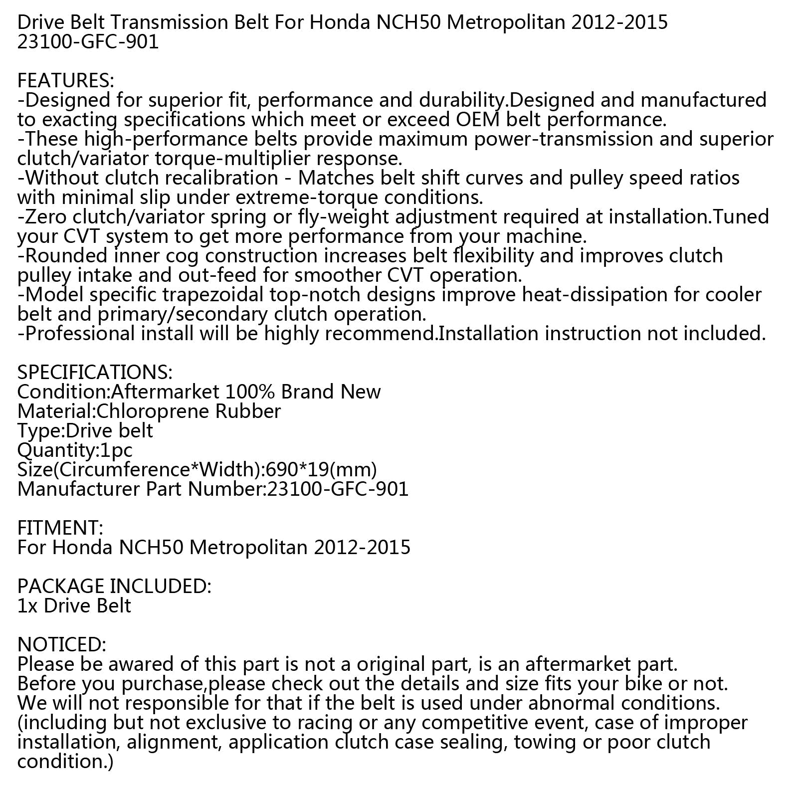 Drive Belt Transmission Belt For Honda NCH50 Metropolitan 2012-2015 23100-GFC-901